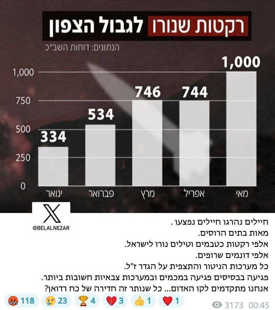 أفادت وسائل الإعلام العبرية أن حزب الله تجاوز كل الخطوط الحمراء في مواجهاته الأخيرة مع إسرائيل. ووفقًا للتقارير، أسفرت هذه التصعيدات عن مقتل وإصابة جنود، تدمير مئات المنازل، حرق آلاف الأراضي الزراعية، وإطلاق آلاف الصواريخ والقذائف على البلاد.