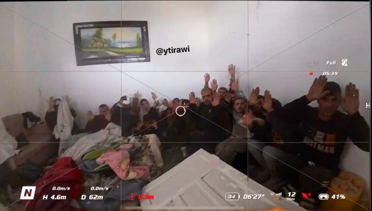 انتشر على مواقع التواصل الاجتماعي مقطع فيديو مثير لجندي إسرائيلي يظهر عدة عائلات فلسطينية، تتضمن أطفالاً، محاصرة داخل منزل ويبدو أنهم يستسلمون للقوات الإسرائيلية في منطقة غزة.