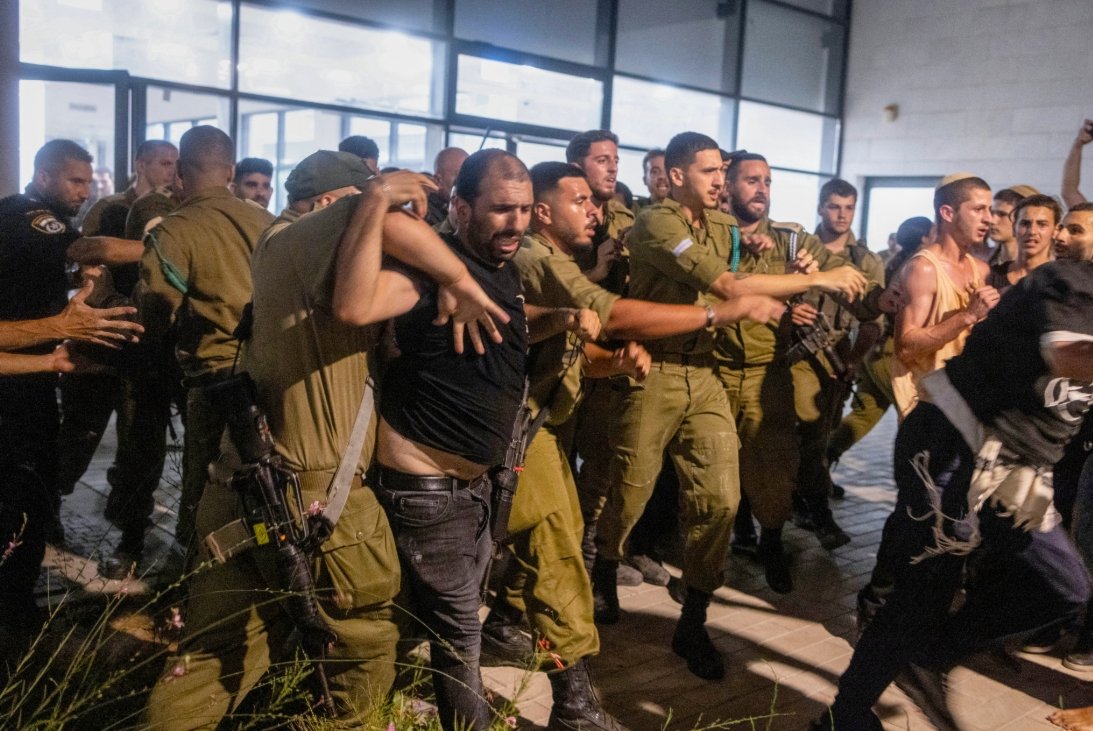 اقتحم عشرات المتظاهرين من التيارات اليهودية اليمينية المتطرفة، بعضهم ملثمون، مركز المحكمة العسكرية في قاعدة بيت ليد، حيث كان يحتجز 9 جنود إسرائيليين بتهمة ارتكاب تجاوزات أخلاقية والتنكيل بأسرى فلسطينيين في سجن “سديه تيمان” العسكري السري. المتظاهرون حاولوا فك احتجاز الجنود رغم تخفيف عقوبتهم بسبب ضغوط وزيري الحكومة بن غفير وسموتريتش.