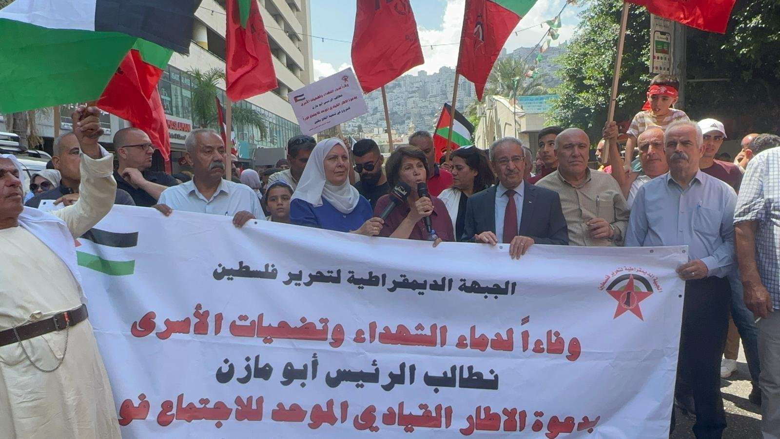 نظمت اليوم الجبهة الديمقراطية لتحرير فلسطين ، مسيرة جماهيرية حاشدة في مدينة نابلس رفعت الشعارات الداعية الى الوحدة الوطنية وانهاء الانقسام، والى تطبيق ما جاء في اتفاق بكين، عبر الدعوة الى عقد اجتماع الإطار القيادي الموحد والمؤقت الذي يرأسه الرئيس أبو مازن، وفد شارك في المسيرة عدد كبير من ممثلي القوى والمؤسسات والفعاليات الشعبية.