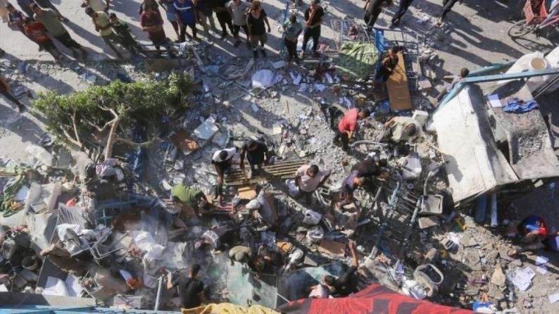 وفجر الأربعاء، استهدف جيش الاحتلال مدرسة الجاعوني التابعة التابعة للأونروا، والتي تؤوي آلاف النازحين في مخيم النصيرات، الذي يقطنه حاليا أكثر من ربع مليون إنسان من أهالي المخيم والنازحين إليه.