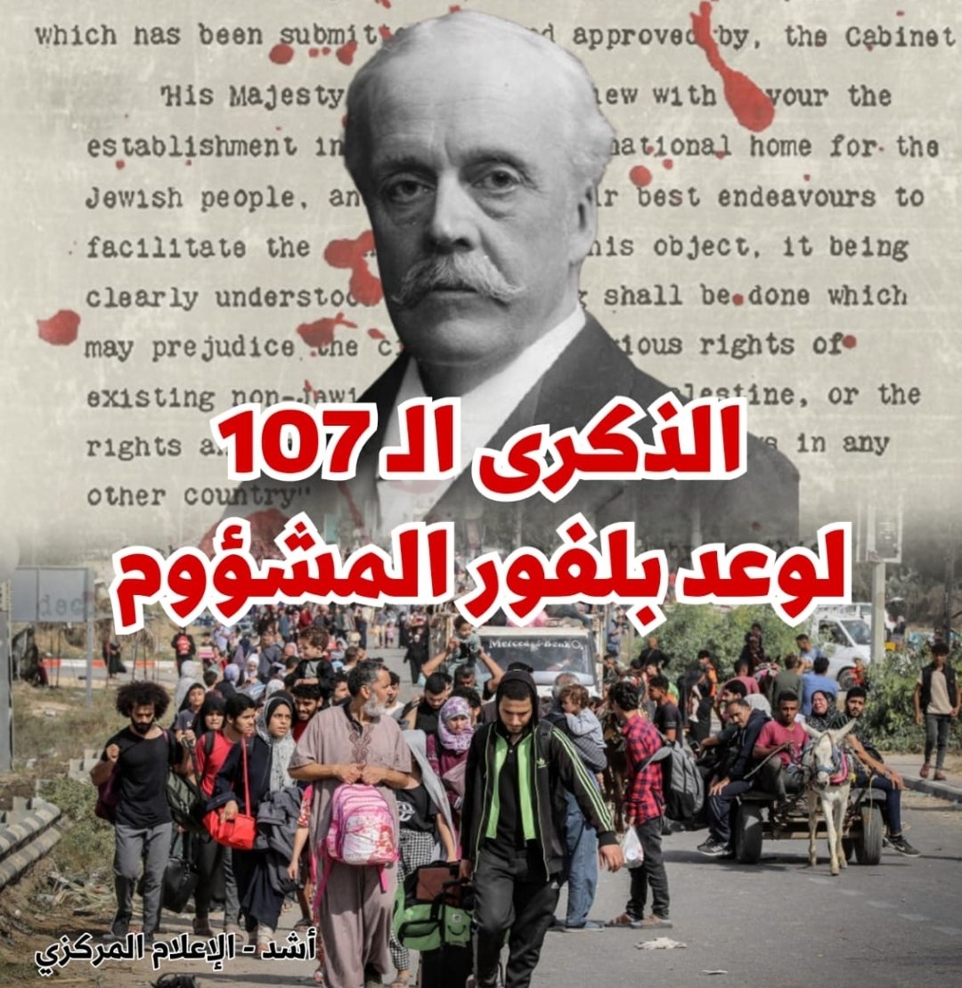 واليوم وبعد 107 أعوام على هذا الوعد المشؤوم ما زالت الحكومات الفاشية وعلى رأسها الولايات المتحدة وبريطانيا والدول الغربية الاستعمارية تقدم الدعم اللا محدود لهذا الاحتلال الفاشي،والذي يمطر شعبنا الفلسطيني واللبناني وباقي شعوب المنطقة بصواريخه المحرمة دوليا، ويقطع بها أجساد الأطفال والنساء لأكثر من 390 يوم. فيقترف بها ما يقارب الـ 3760 مجزرة ويقتل اكثر من 53 ألف شهيد معظمهم من النساء والأطفال ويمحو 1206 عائلة فلسطينية من السجلات اكثر من 101 ألف شهيد ويفرض حصارا خانقا يسبب مجاعة في القطاع .