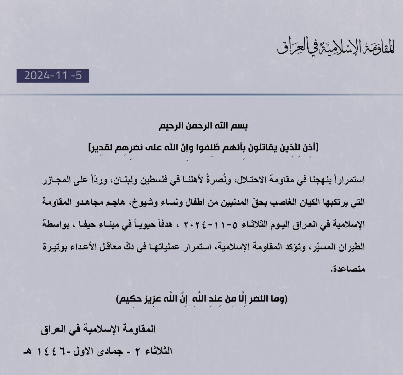 المسار الاخباري:أعلنت المقاومة الإسلامية في العراق، اليوم، عن تنفيذ عملية ناجحة استهدفت هدفاً حيوياً في ميناء حيفا، باستخدام الطيران المسيّر. وذكرت مصادر من المقاومة أن العملية تأتي في إطار الرد على الانتهاكات الإسرائيلية المتواصلة ضد الفلسطينيين، وتأكيداً على موقفها الثابت في دعم حقوق الشعب الفلسطيني.