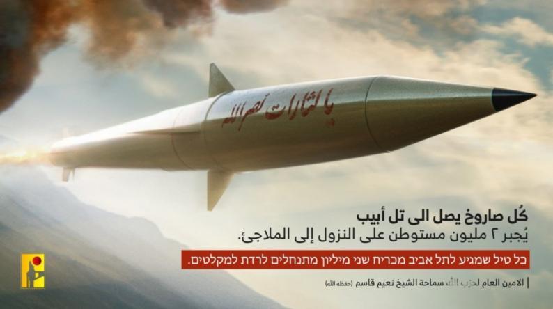 كما أرفق الإعلام الحربي في حزب الله خبر دوي صفارات الإنذار في وسط الأراضي الفلسطينية المحتلة بصورة نشرها لصاروخ كُتب عليه “يالثارات نصرالله”، مع جملة الأمين العام لحزب الله، الشيخ نعيم قاسم، في الصورة: “كل صاروخ يصل إلى تل أبيب يُجبِر 2 مليون مستوطن على النزول إلى الملاجئ”.