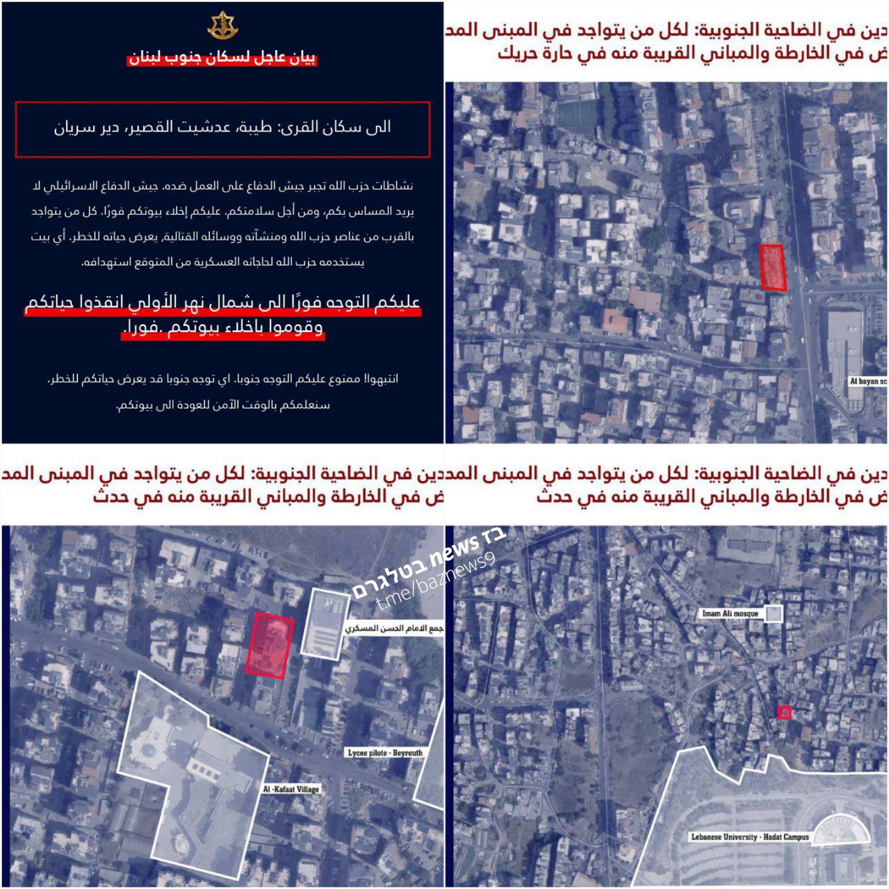 المسار الإخباري :جنوب لبنان – أصدر جيش الاحتلال أوامر بإخلاء مباني في منطقة الحدث وحارة حريك في الضاحية الجنوبية لبيروت، بالإضافة إلى مناطق المعشوق وبرج الشمالي في قضاء صور، تمهيدًا لاستهدافها بالقصف.