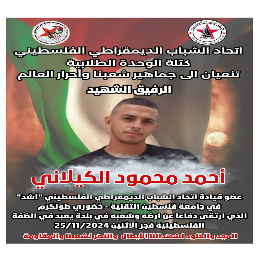 المسار الإخباري :على درب الحرية والنصر والمقاومة، تنعي السكرتاريا العامة المركزية لاتحاد الشباب الديمقراطي الفلسطيني “أشد” وكتلة الوحدة الطلابية الى جماهير شعبنا الفلسطيني واحرار العالم الرفيق الشهيد المشتبك “أحمد محمود الكيلاني” عضو قيادتها في جامعة فلسطين التقنية في طولكرم، والذي ارتقى شهيدا على ارض الوطن خلال مواجهات مع قوات الاحتلال في بلدة يعبد جنوب جنين في الضفة الفلسطينية المحتلة دفاعا عن الأرض وحق الشعب الفلسطيني .