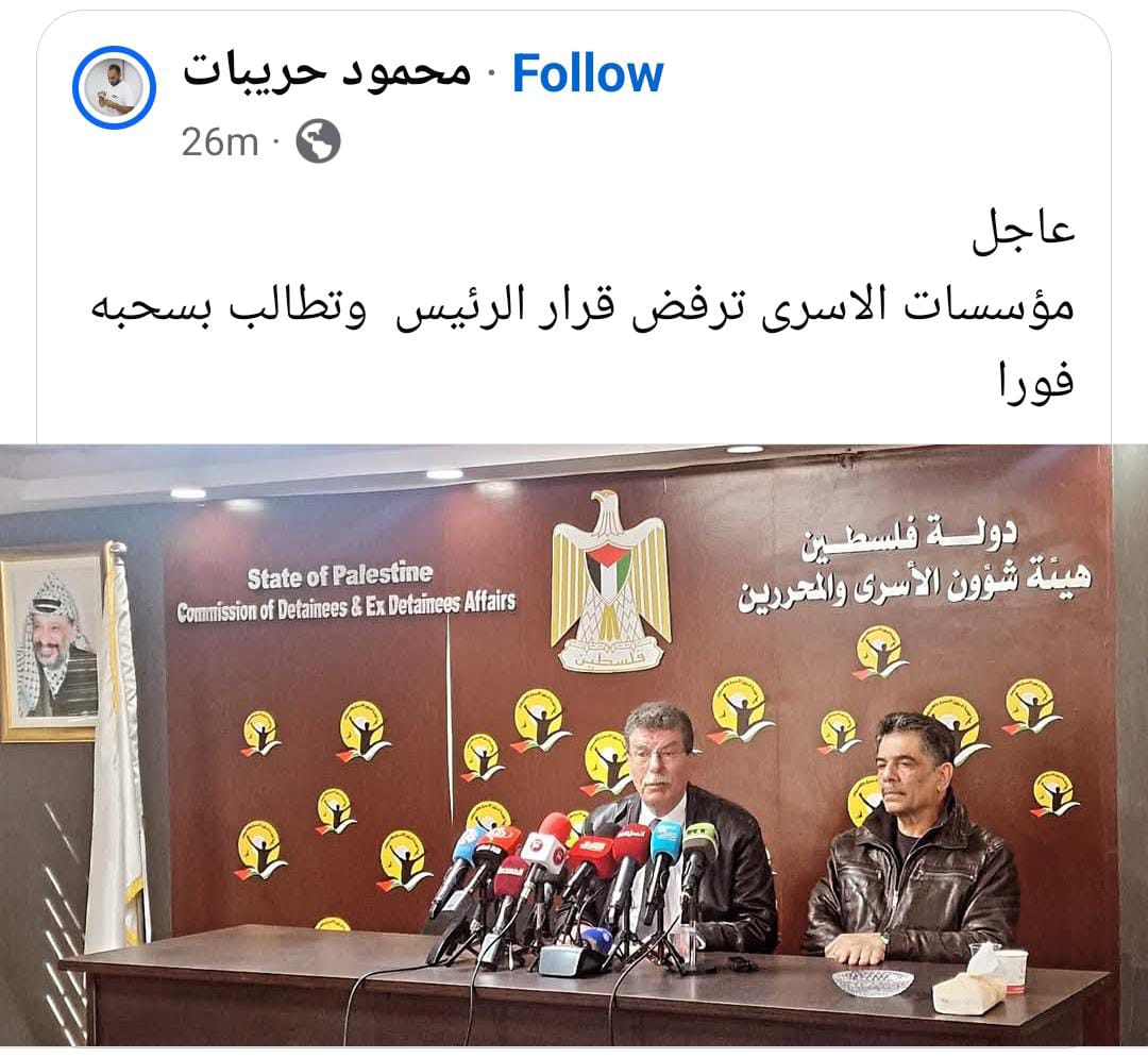 و عقد مساء امس الاثنين اجتماع لمؤسسات الاسرى ممثلا بهيئة الاسرى والمحررين ونادي الاسير ومؤسسات حقوقية عاملة في مجال الاسرى اجتماعا استمر حتى وقت متأخر ناقش تفاصيل قرار الرئيس وحيثياته.