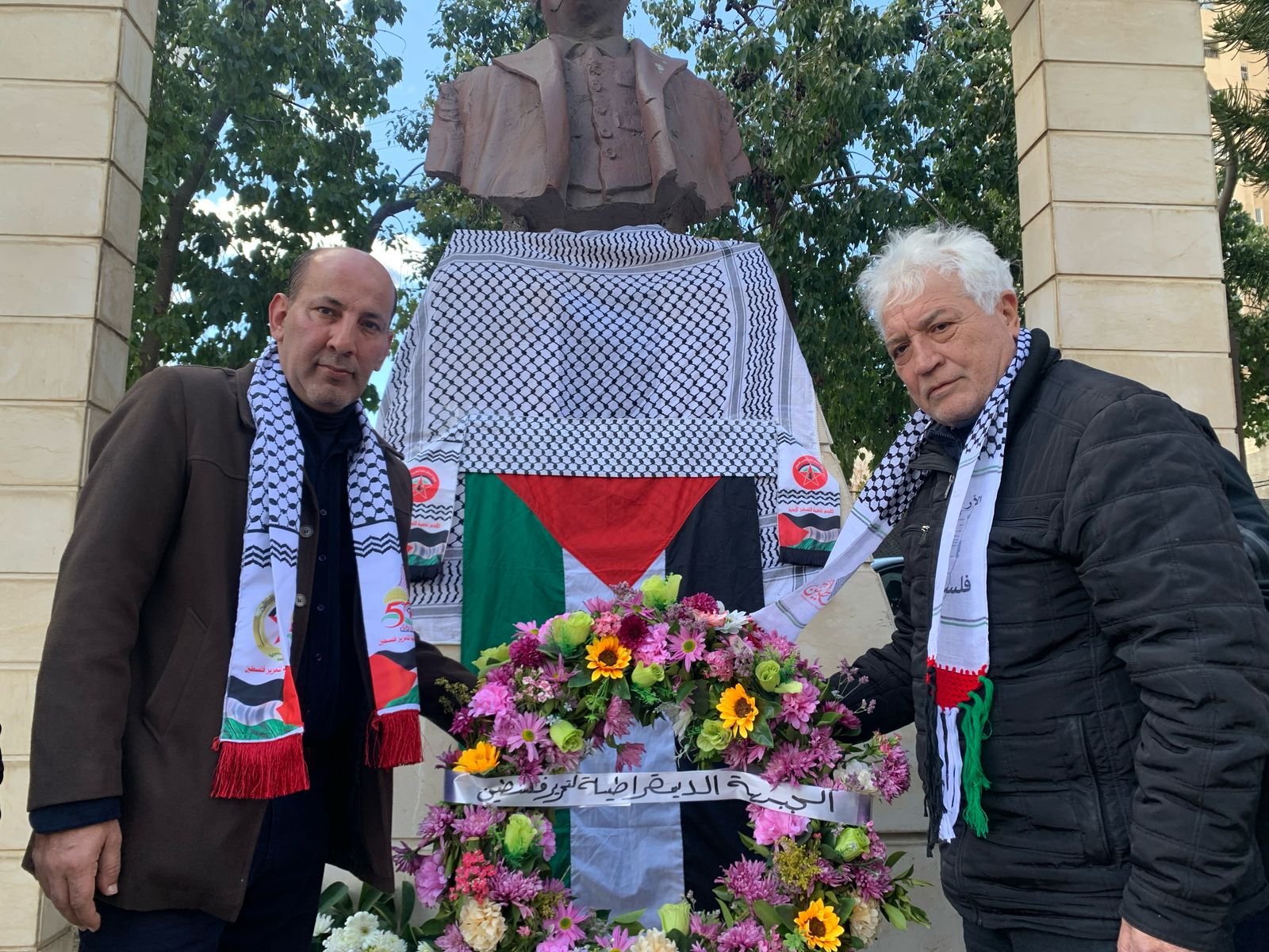 زهور وكوفية وعلم فلسطين تحية من الجبهة الديمقراطية للشهيد معروف سعد بالذكرى الخمسين لإستشهاده