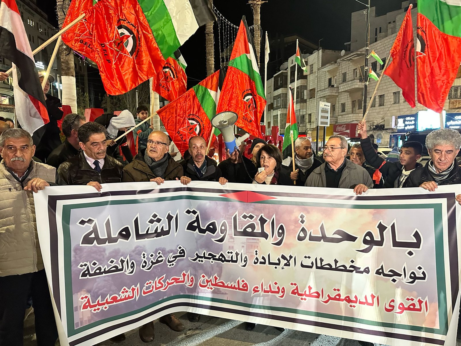 المسار : نظّمت الجبهة الديمقراطية لتحرير فلسطينين مساء اليوم الإثنين مسيرة جماهيرية حاشدة في رام الله تنديدا بالعدوان على على شعبنا وحرب الإبادة التي يشنها الإحتلال في غزة والضفة وخاصة في شمالها ، وجابت المسيرة شوارع مدينة رام الله مردّدة الهتافات والشعارات الوطنية  .