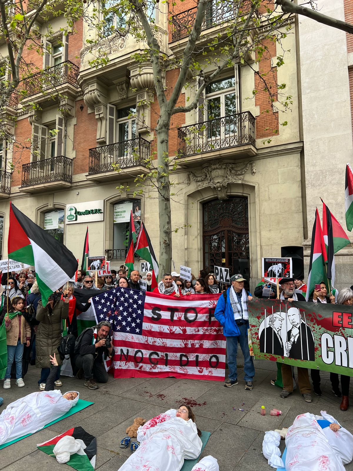 المسار الاخباري: شهدت العاصمة الإسبانية مدريد يوم السبت الموافق 12/4/2025 تظاهرة حاشدة أمام السفارة الأمريكية، حيث تجمع المشاركون للتعبيرعن دعمهم للقضية الفلسطينية ورفضهم للإبادة الجماعية المستمرة في غزة والضفة الغربية التي يقوم بها الاحتلال الاسرائيلي بحق الشعب الفلسطيني، شارك فيها ابناء الجالية الفلسطينية بكثافة وحضور بارز، ومشاركة شخصيات من ابناء الجالية الفلسطينية، وعدد من الشخصيات الإسبانية الداعمة للقضية الفلسطينية، رفع المشاركون الاعلام الفلسطينية و رددوا شعارات تطالب بوقف الإبادة الجماعية في غزة والضفة الغربية، ودعوا إلى تدخل سريع من المحكمة الدولية. كما قام بعض المشاركين بتمثيل جثامين الأطفال الفلسطينيين، في إشارة إلى معاناة الأطفال تحت الاحتلال، وما يرتكبه هذا الاحتلال من وحشية ضد الاطفال، وقد وجهت التظاهرة رسالة قوية للمجتمع الدولي ليتمل مسؤولياته القانونية والاخلاقية، ولتؤكد على ضرورة التحرك العاجل لوقف العدوان الإسرائيلي ودعم حقوق الشعب الفلسطيني.