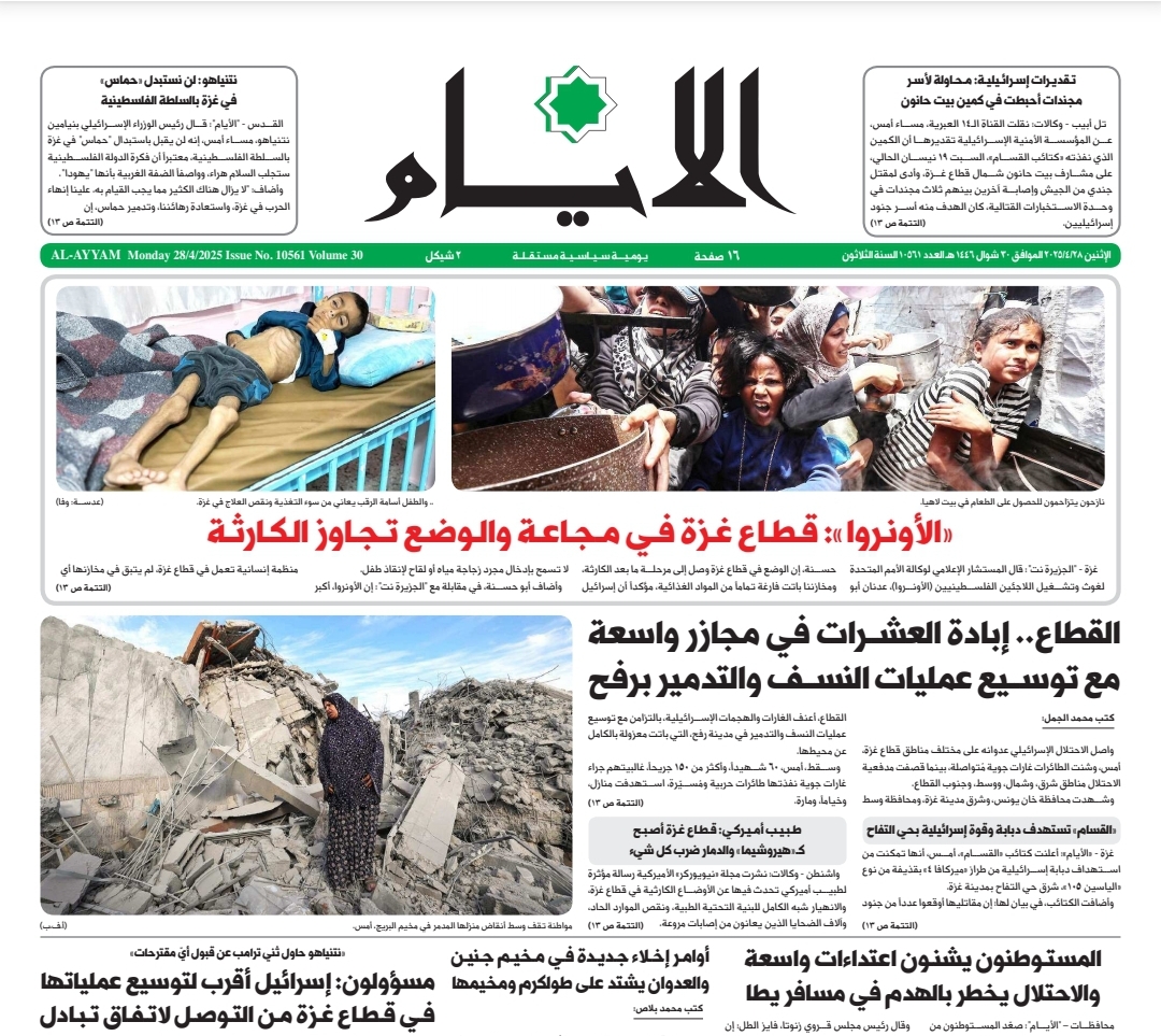 الأيام كانت أكثر تفصيلًا في عرض المعاناة اليومية للفلسطينيين في غزة، حيث نقلت عن الأونروا تحذيراتها من المجاعة المتزايدة في القطاع بعد نفاد مخزون الطحين. الصحيفة أيضًا رصدت تصاعد العدوان على رفح والمخيمات في جنين وطولكرم، بالإضافة إلى الهجمات التي تعرضت لها مناطق فلسطينية أخرى من قبل المستوطنين المدعومين من الجيش الإسرائيلي.