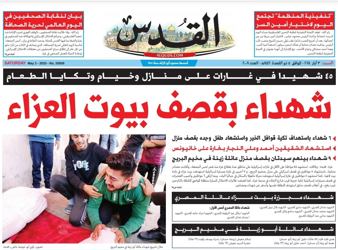 المسار الإخباري :تصاعد العدوان على قطاع غزة، واستشهاد أكثر من 45 مواطنًا وإصابة العشرات، شكّل العنوان الأبرز في تغطية الصحف الفلسطينية الثلاث “الحياة الجديدة”، “القدس”، و”الأيام” الصادرة صباح اليوم السبت 3 أيار/مايو 2025، في ظل تحذيرات رئاسية من استمرار جرائم الاحتلال وسياسة الحصار والتجويع الممنهجة.