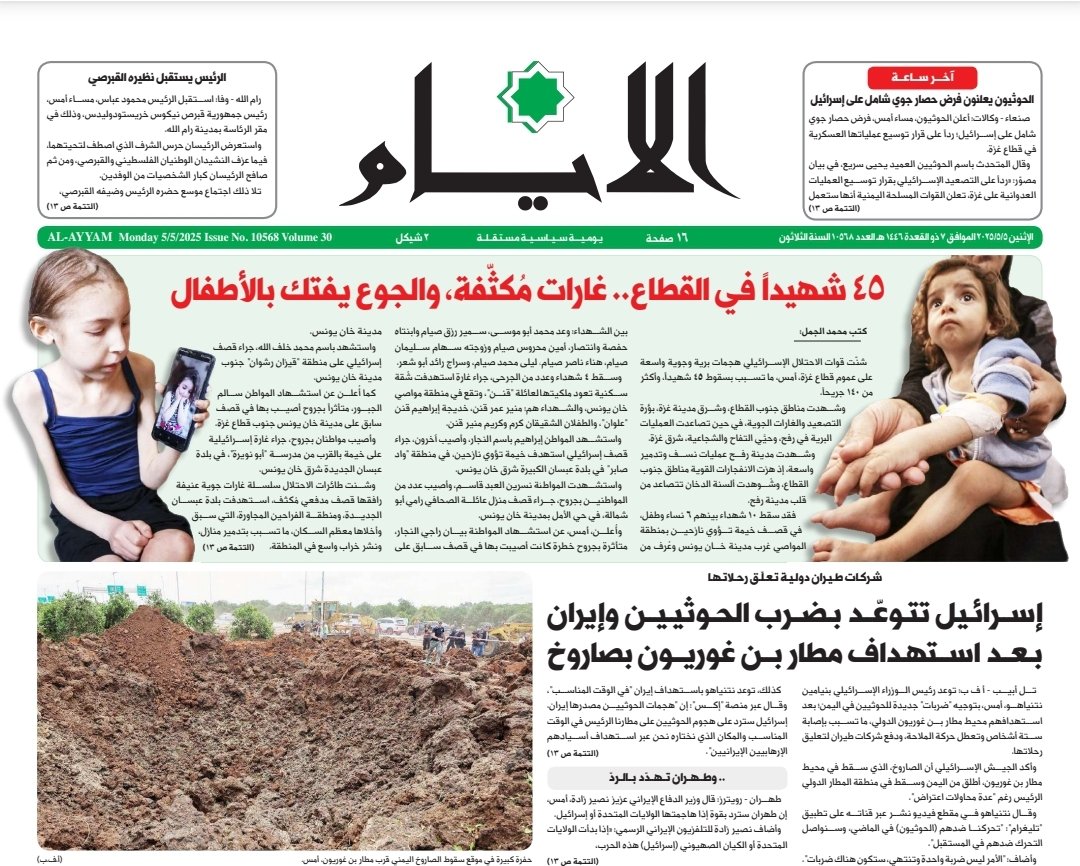 وفي عناوينها، شدّدت صحيفة “الأيام” على أن الغارات الإسرائيلية ازدادت عنفاً، مشيرة إلى أن الجوع بات “يفتك بالأطفال”، فيما أكدت صحيفة “القدس” أن “الجوع يعض الأطفال ويفتك بالرضع”، وسط تعذّر عمليات الإنقاذ تحت الأنقاض.