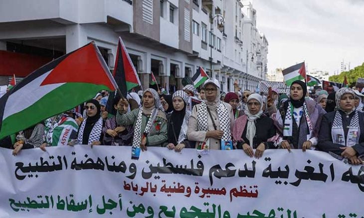 وشهدت مدينة طنجة شمال المغرب، مؤخراً، مسيرة حاشدة شارك فيها مئات المواطنين من مختلف الأعمار، رجالاً ونساء، تضامناً مع الشعب الفلسطيني في مواجهة حرب الإبادة الإسرائيلية، واحتجاجاً على ما تردّد من أنباء حول رسوّ سفينة شحن دولية آتية من الولايات المتحدة في ميناء طنجة المتوسطي، يُشتبه أنها تحمل معدات عسكرية في اتجاه إسرائيل، وفق ما ذكرت هيئات حقوقية مدنية.