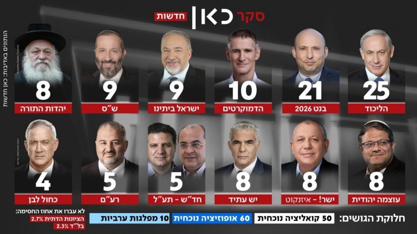 وحسب الاستطلاع، حصل الليكود على 25 مقعدا، بينما يأتي حزب رئيس الوزراء السابق نفتالي بينت في المرتبة الثانية بـ21 مقعدا، تلاه حزب “الديمقراطيون” بقيادة يائير جولان بـ10 مقاعد.