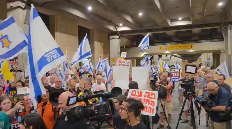 المسار : تجمع مئات المتظاهرين في قاعة الوصول بمطار بن غوريون، مساء اليوم الأربعاء، احتجاجًا على رئيس الوزراء الإسرائيلي بنيامين نتنياهو، قبيل مغادرته إلى نيويورك للمشاركة في اجتماعات الجمعية العامة للأمم المتحدة.