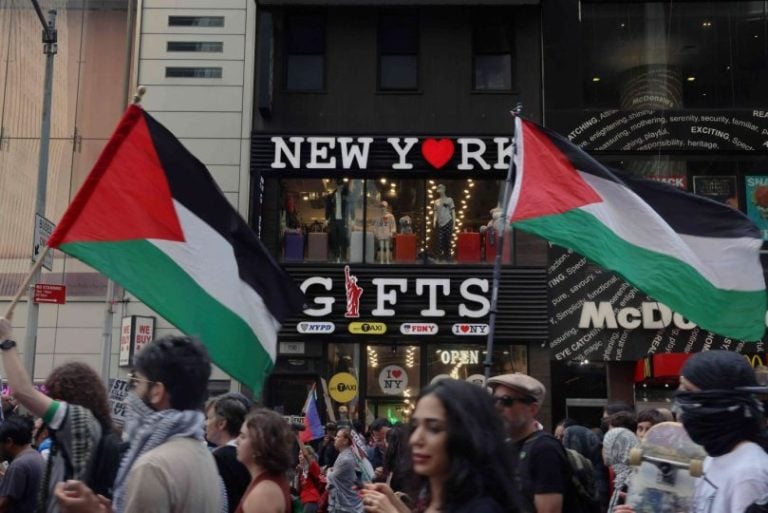 المسار : تظاهر متظاهرون مؤيدون للفلسطينيين في مانهاتن قرب مبنى الأمم المتحدة، بينما كان رئيس الوزراء الإسرائيلي بنيامين نتنياهو يلقي كلمة أمام الجمعية العامة للأمم المتحدة خلال الدورة الثمانين، في نيويورك. وطالب المتظاهرون بإنهاء الحرب في غزة.