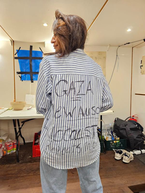 ولفتت حياة اليماني الأنظار خلال لحظة اعتقالها، حيث ارتدت قميصًا مخطّطًا بالأبيض والأزرق يشبه زيّ المعتقلين في معسكر “أوشفيتز”، مكتوبًا عليه بوضوح: “Gaza = Auschwitz” و “Holocaust is repeating”.