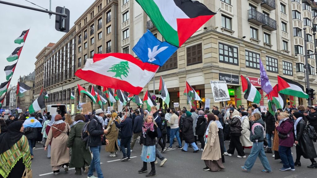 المسار : شهدت العاصمة الألمانية برلين يوم أمس 1/11/2025 تظاهرة جماهيرية حاشدة انطلقت من قرب السفارة البريطانية، والسفارتين الأمريكية والفرنسية، بمشاركة المئات من المتظاهرين من مختلف الجنسيات والخلفيات، ورُفعت لافتات تطالب بالحرية لفلسطين، الكرامة للسودان، والصمود للبنان، وسط تأكيد أن الشعوب لم تعد تصدّق روايات القتلة، وأن صوت الضمير سيبقى يلاحق المجرمين مهما طال الزمن، جاءت هذه الوقفة التضامنية في ظل تصاعد الأزمات الإنسانية في غزة، السودان، ولبنان، وسط دعوات دولية متزايدة لوقف القتال ورفع الحصار.
