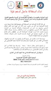 نوجّه هذا النداء العاجل إلى جميع الأحرار والمؤسسات الإنسانية والجهات المانحة في العالم، من أجل تقديم الدعم والمساعدة العاجلة لشعبنا الفلسطيني في غزة.