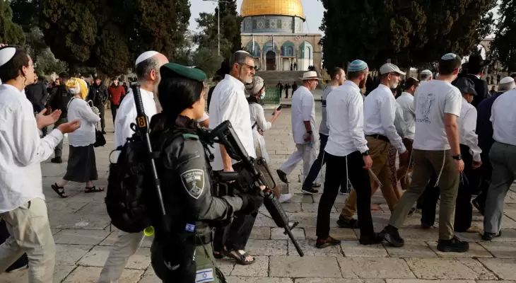 ويتعرض المسجد الأقصى لاقتحامات يومية من المستوطنين، عدا الجمعة والسبت، ضمن مساعٍ لفرض التقسيم الزماني والمكاني على الحرم الشريف.