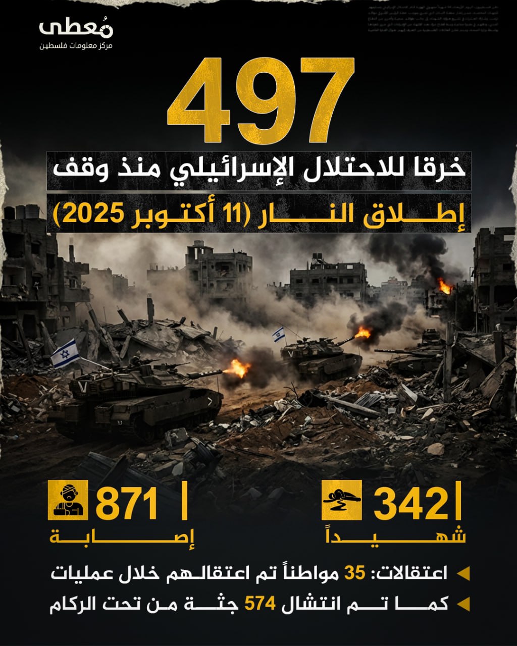 المسار :سجل الاحتلال الإسرائيلي منذ دخول وقف إطلاق النار حيز التنفيذ في 11 أكتوبر 2025، 497 خرقاً، أسفرت عن: