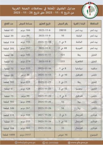 المسار : أعلنت سلطة الأراضي عن تعليق ستة عشر جدول حقوق للاعتراض في عدد من محافظات الضفة الغربية، ويشمل التعليق جداول موزعة على خمس محافظات وهي: الخليل، بيت لحم، نابلس، سلفيت، وطولكرم، وبمساحة إجمالية تبلغ 3117 دونمًا، تتضمن ما مجموعه 1499 قطعة أرض.