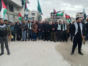 ورفع المشاركون الأعلام الفلسطينية والسورية، وردّدوا هتافات تعبّر عن وحدة المصير بين الشعبين الفلسطيني والسوري، وعن الدور التاريخي لأبناء المخيمات الفلسطينية في الوقوف إلى جانب سورية ووحدتها وأمنها واستقرارها، والحفاظ على النسيج الاجتماعي الذي جمع الشعبين لعقود طويلة.