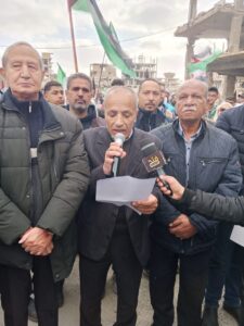 وفي كلمته، أكد الرفيق حسن عبد الحميد أن مشاركة أبناء المخيمات الفلسطينية في سوريا في احتفالات إحياء انتصار الثورة السورية تعبّر عن الوفاء الأصيل لسوريا التي احتضنت الشعب الفلسطيني منذ النكبة، وعن وحدة الموقف في مواجهة الاحتلال الإسرائيلي وسياساته العدوانية التي تستهدف شعوب المنطقة كافة. وشدد على أن سوريا كانت وستبقى سنداً ثابتاً لقضية فلسطين، وأن انتصار ثورتها شكل محطة وطنية مفصلية في كسر مشاريع التفتيت وإفشال المخططات الهادفة إلى إعادة رسم خريطة المنطقة بما يخدم مصالح الاحتلال والإمبريالية.