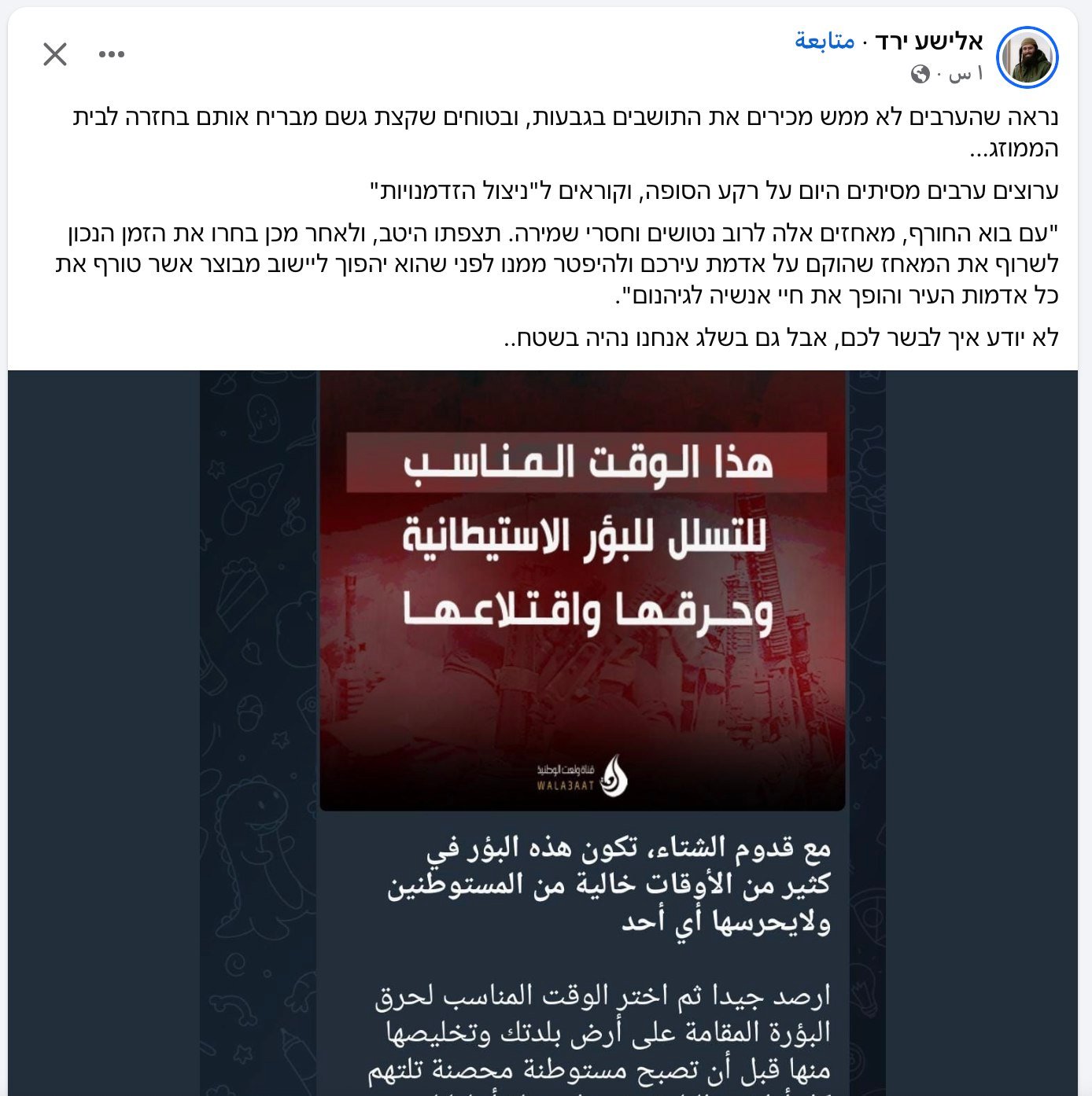 المسار :شارك أحد أبرز قادة الحركة الاستيطانية في الضفة الغربية، إلييشع فارد، منشورًا استفزازيًا على صفحات عربية، أطلق فيه سلسلة من التحديات المباشرة للفلسطينيين، بالتزامن مع العاصفة الجوية التي تضرب المنطقة.