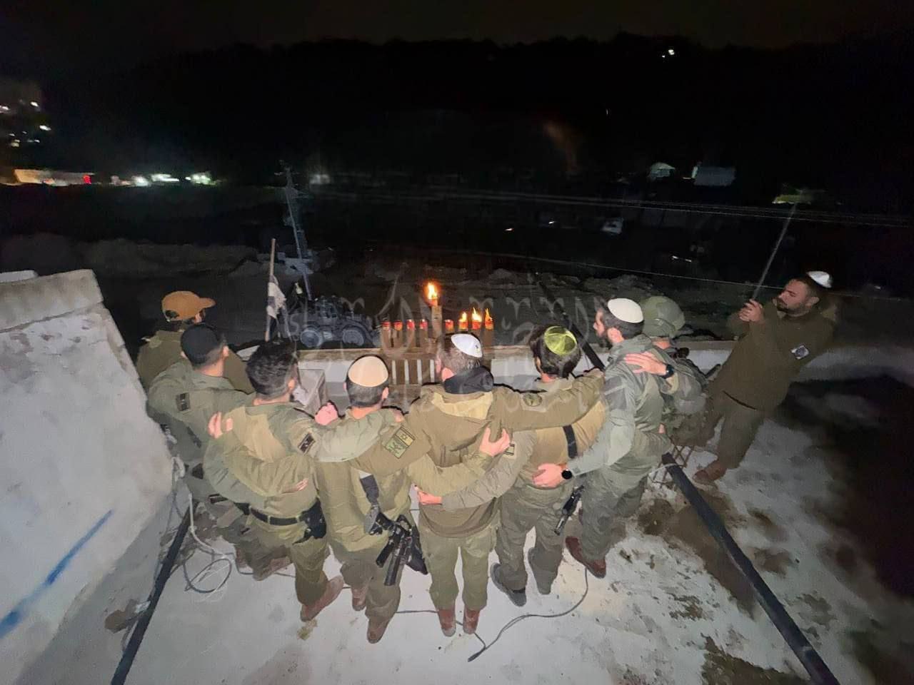 المسار :أقدم جنود من جيش الاحتلال على إضاءة الشمعدان احتفالًا بما يُسمّى عيد الأنوار اليهودي “الحانوكاة” داخل مخيم نور شمس شرقي مدينة طولكرم، شمالي الضفة الغربية.