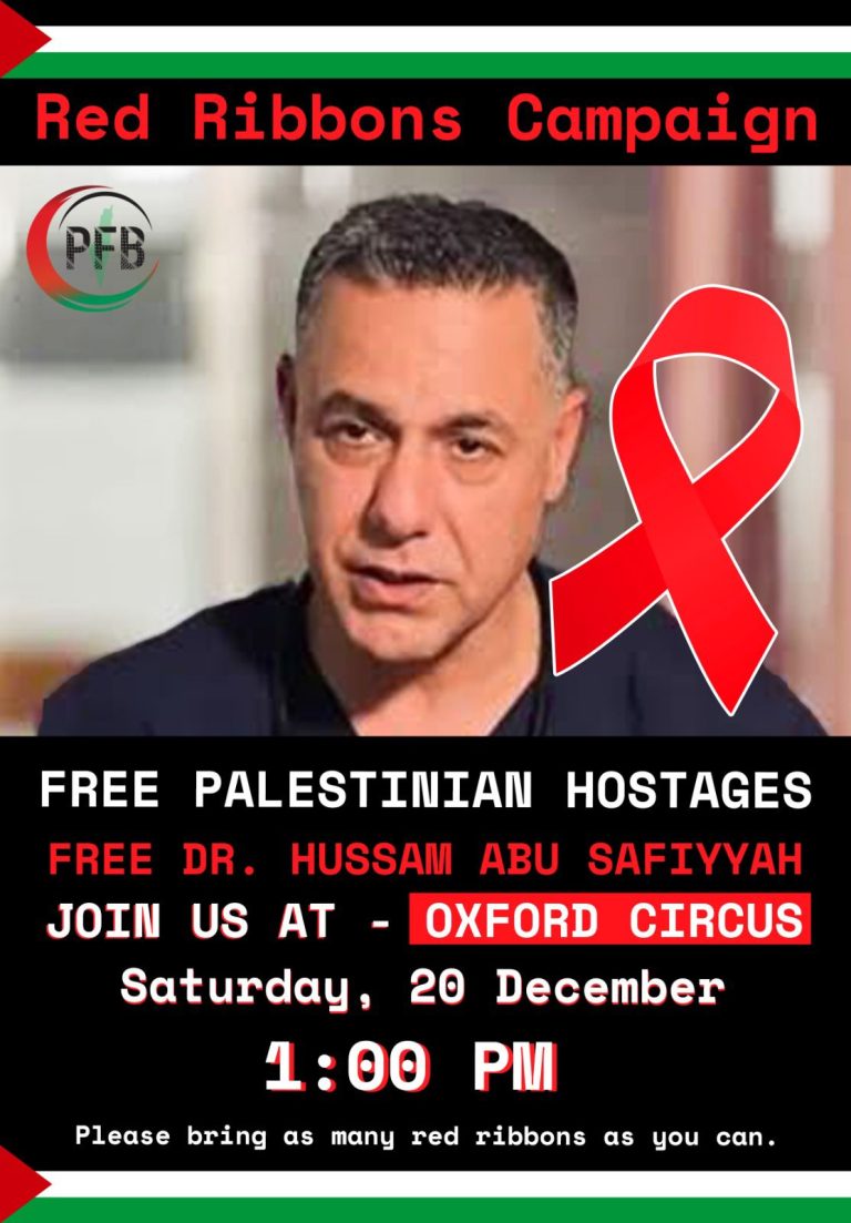 المسار : أعلن “المنتدى الفلسطيني في بريطانيا”، اليوم الخميس، عن إطلاق حملة تضامنية جديدة للمطالبة بالإفراج عن الدكتور حسام أبو صفية وجميع الأسرى الفلسطينيين في سجون الاحتلال الإسرائيلي، عبر فعالية رمزية صامتة تحمل اسم “حملة الأشرطة الحمراء”، والمقرر تنظيمها يوم السبت 20 كانون الأول/ديسبمر في ساحة “أوكسفورد سيركس” وسط لندن عند الساعة الواحدة ظهرًا.