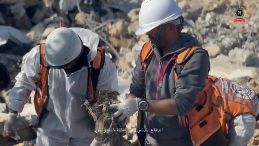 انتشال جثامين 14 شهيدًا من تحت أنقاض منزل بخانيونس من قبل الدفاع المدني