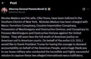 المسار : في خطوة استثنائية ونادرة على مستوى القانون الدولي، أعلنت المدعية العامة الأمريكية باميلا بوندي عن توجيه لائحة اتهام رسمية ضد الرئيس الفنزويلي نيكولاس مادورو وزوجته سيليا فلوريس في المحكمة الجزئية الجنوبية لنيويورك. وتشمل التهم الموجهة إليهما: الإرهاب والمخدرات والتآمر لاستيراد الكوكايين، وحيازة أسلحة رشاشة وأجهزة تدميرية موجهة ضد الولايات المتحدة.