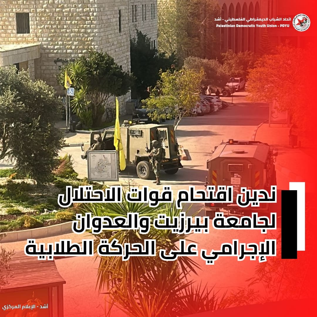 اتحاد الشباب الديمقراطي الفلسطيني يدين اقتحام الاحتلال جامعة بيرزيت ويعتبره عدوانًا إجراميًا على الحركة الطلابية
