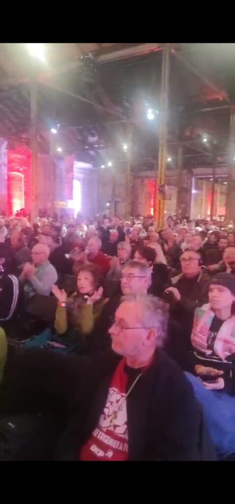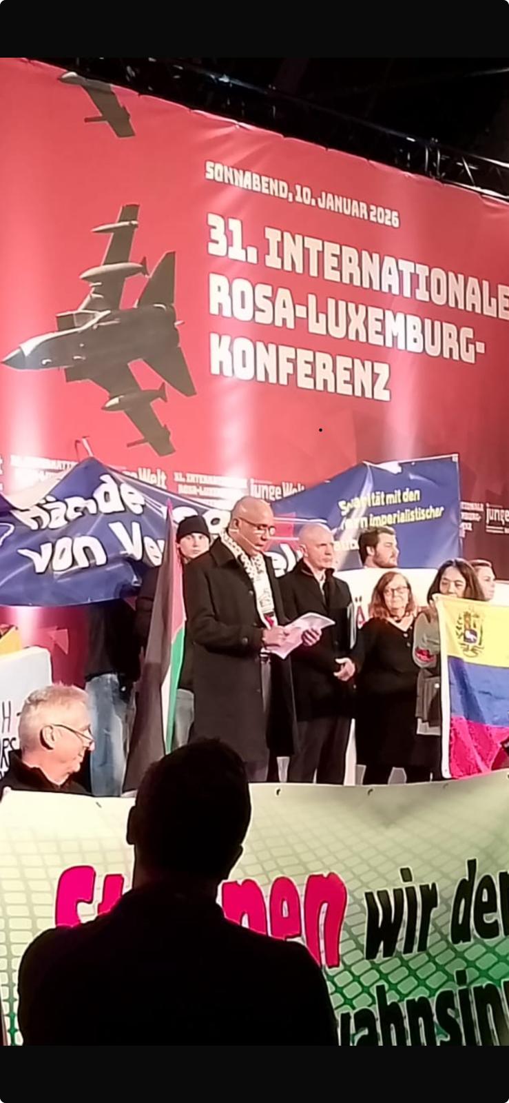 وفي القاعة الرئيسية للمؤتمر وبمشاركة سفارة فنزويلا وكوبا وبعد القاء كلماتهم تم تقديم الرفيق ابو رامي ليتحدث باسم فلسطين وباسم اتحاد الجاليات الفلسطينية في أوروبا (اجمع) حيث استقبل بالوقوف من الجمهور وبتصفيق حار لفلسطين وشعب فلسطين وبالهتافات من اجل السلام والحرية لفلسطين .