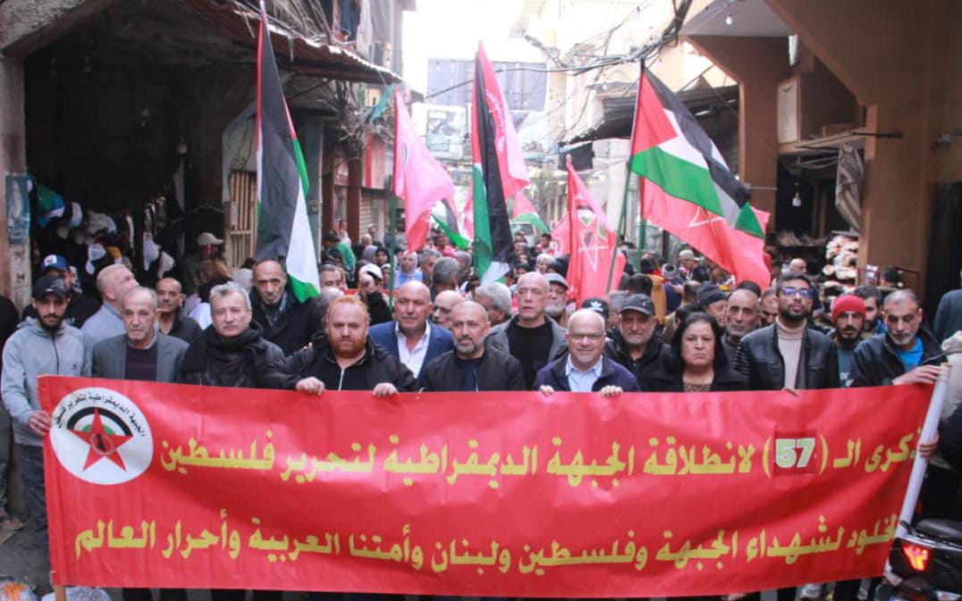 المسار :نظّمت الجبهة الديمقراطية لتحرير فلسطين لمناسبة الذكرى السابعة والخمسين لانطلاقتها مسيرة جماهيرية حاشدة في مخيم برج البراجنة في العاصمة اللبنانية بيروت، بمشاركة واسعة من ممثلي القوى والفصائل الفلسطينية والأحزاب اللبنانية، واللجان الشعبية، والروابط الاجتماعية، والمؤسسات والجمعيات الأهلية، إلى جانب فعاليات وطنية واجتماعية وأهالي المخيم، وحشد كبير من الرفيقات والرفاق في صفوف الجبهة ومنظماتها الجماهيرية تقدمهم عضو المكتب السياسي للجبهة الرفيقة خالدات حسين، وعضوي اللجنة المركزية محمد حسين ومحمود الشوني وعدد من أعضاء قيادة الجبهة في لبنان والمخيم.