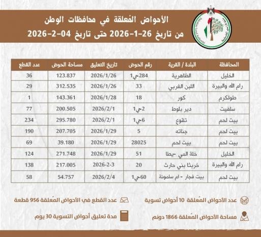 وأوضحت سلطة الأراضي أن الأحواض المعلّقة شملت محافظات الخليل، رام الله والبيرة، طولكرم، سلفيت، وبيت لحم، بمساحة إجمالية بلغت 1866 دونماً، وتضم ما مجموعه 956 قطعة أرض.