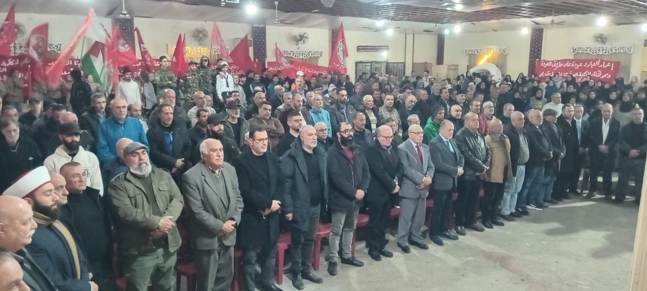 كلمة الجبهة الديمقراطية لتحرير فلسطين القاها نائب رئيس المجلس الوطني الفلسطيني ونائب الأمين العام للجبهة الرفيق علي فيصل: الذي استعرض مسيرة الجبهة النضالية منذ انطلاقتها على مختلف المستويات العسكرية والسياسية والجماهيرية والفكرية، مؤكداً أن الشعب الفلسطيني نجح بصموده ووعيه في إعادة قضيته إلى موقعها الطبيعي كقضية تحرر وطني. وأن الجبهة الديمقراطية تستمد قوتها من تضحيات الشعب الفلسطيني في غزة والضفة والشتات. واكد أن صمود الشعب والمقاومة في مواجهة حرب الإبادة يدلل على إمكانية هزيمة المشروع الصهيوني. وان قطاع غزة سيبقى فلسطينيا وجزءا من الدولة الفلسطينية المستقلة، داعيا الوسطاء والاطراف الضامنة الى تحمل مسؤولياتها، باجبار الاحتلال على وقف عدوانه وتمكين اللجنة الوطنية لإدارة غزة من اداء دورها، في اطار مرجعية منظمة التحرير الفلسطينية الممثل الشرعي والوحيد لشعبنا، وبما يُمهد لاطلاق عملية الاعمار الشامل في القطاع وانسحاب الاحتلال بشكل كامل. واضاف قائلا: إن المشروع الإسرائيلي يستهدف مختلف عناوين القضية الفلسطينية، وفي مقدمتها قضية اللاجئين، التي تتعرض لهجوم إسرائيلي وأميركي واضح. وهذا يفرض على حركتنا الوطنية ضرورة امتلاك برنامج عمل موحد للدفاع عن حق العودة وصون قضية اللاجئين، ودعم وكالة الأونروا بالموارد المالية اللازمة لأداء دورها، والتصدي لتدمير مخيمات الضفة وغزة وتهجير ابنائها. ودعا الى مواجهة هذه التحديات بصياغة استراتيجية وطنية فلسطينية شاملة، قادرة على التصدي لكل المخاطر التي تستهدف اللاجئين وحقهم بالعودة الى ديارهم وممتلكاتهم. وشدد فيصل بان طريق الخلاص يبدأ بتفعيل مؤسسات منظمة التحرير وتعزيز دورها التمثيلي، وعقد مجلس مركزي وانتخاب لجنة تنفيذية جديدة بمشاركة الجميع، ووضع استراتيجية نضالية شاملة لقيادة معركة التحرر الوطني، وتعزيز وحدة الميدان في مواجهة تداعيات حرب الابادة في غزة ومخطط الضم في الضفة والتدخل لوقف قانون الاعدام واطلاق سراح الأسرى، واستنهاض طاقات الشعب الفلسطيني، وتوسيع الدعم العربي والدولي لقضيته. لمواجهة مشروع نتنياهو لبناء دولة اسرائيل وهندسة خارطة المنطقة بالشراكة الامريكية الاستعمارية لبناء شرق اوسط جديد. والتصدي للتمييز العنصري والجريمة المنظمة في الاراضي المحتلة عام ١٩٤٨. وشدد فيصل بان الرهان يجب ان يكون على الشعب الفلسطيني وصموده وثباته ومقاومته وعلى دعم شعوب المنطقه واحرار العالم وليس على الوعود الامريكية، وعزل دولة اسرائيل وسحب الاعتراف بها ومقاطعتها على مختلف الصعد. واكد اصرار الشعب الفلسطيني على مواصلة كفاحه لتحقيق اهدافه في العوده وتقرير المصير واقامة الدولة الفلسطينية المستقلة وعاصمتها القدس على كامل الاراضي المحتلة حتى حدود الرابع من حزيان عام ١٩٦٧. وقدر فيصل عاليا الحراك الشعبي الدولي وجبهة العدالة الدولية، ودعا لاتساع دائرته ودائرة المقاطعة الاقتصاية ومناهضة الاحتلال. وحيا قوى المقاومة في المنطقة، وادان الاعتداء على فنزويلا وخطف رئيسها وتصعيد الحصار ضد كوبا وحشد الاساطيل لاستهداف ايران. كما حيا لبنان ومقاومته وتضحيات شعبه دفاعا عن القضية الفلسطينية، واكد التزام الشعب الفلسطيني بالسيادة اللبنانية، ودعا للتعاطي مع المخيمات باعتبارها بيئة سياسية ونضالية وليست امنية، وجدد الدعوة لتوحيد الموقف الفلسطيني في لبنان وتنظيم تحركات جماهيرية موحدة، والعمل على تنظيم العلاقات الفلسطينية اللبنانية على اسس سياسية وقانونية واقتصادية وامنية، بما يضمن اقرار الحقوق الانسانية والحفاظ على الاونروا وصيانة امن واستقرار المخيمات دعما لنضال اللاجئين من اجل حق العودة وافشال مخطط التوطين والتهجير، ودعا لاستكمال اعمار مخيم نهر البار والتعويض على العائلات واعمار المباني المهدمة وانصاف العائلات في الجزء الجديد منه، والمهجرين الفلسطينيين من سوريا.