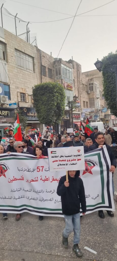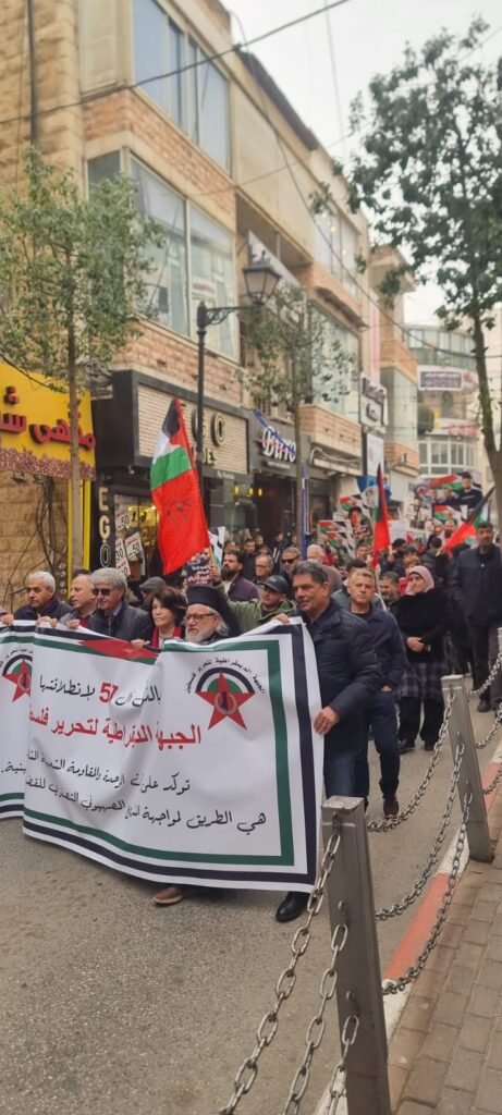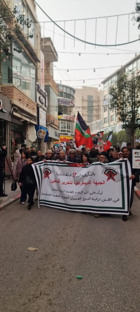 المسار: أحيت الجبهة الديمقراطية لنحرير فلسطين في محافظة رام الله والبيرة الذكرى الـ57 للانطلاقة ، بوقفة على دوار المنارة ومسيرة جابت شوارع رام الله ،بمشاركة حشد كبير من أعضاء الجبهة وأنصارها والقوى الوطنية والشخصيات الوطنية، تتقدمهم الرفيقة ماجدة المصري نائب الأمين العام للجبهة ، وسط هتافات وطنية مساندة لنضال الأسرى الفلسطينيين في سجون الإحتلال ، ومتعهدة باستمرار النضال حتى نيل حقوق شعبنا الوطنية في الإستقلال الوطني وحتى نيل الأسرى حريتهم .