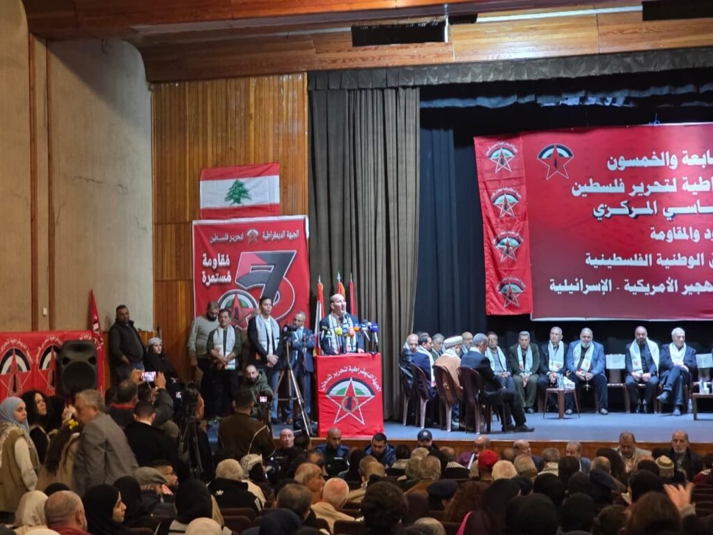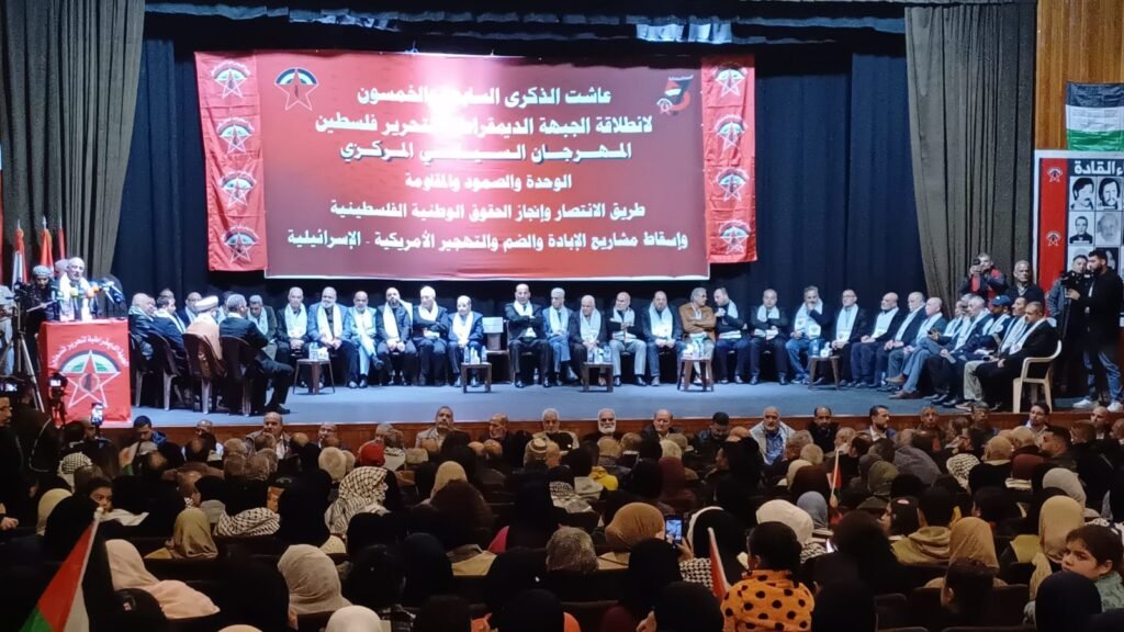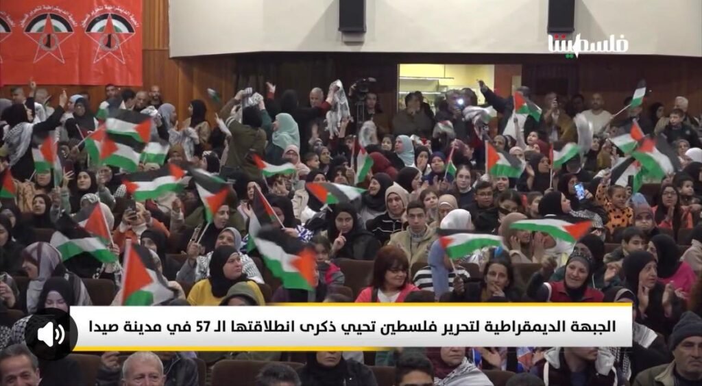 المسار :غصّت قاعة الشهيد معروف سعد الثقافي وباحاتها الخارجية في مدينة صيدا، جنوب لبنان، بالحشود السياسية والوطنية والجماهيرية، في المهرجان السياسي المركزي (مهرجان الوحدة والصمود والدفاع عن الأرض والحقوق والوجود)، الذي أُقيم إحياءً للذكرى الـ(57) لانطلاقة الجبهة الديمقراطية لتحرير فلسطين، بحضور النائب د. عبد الرحمن البزري، و الأخ ناصيف عيسى ممثل النائب أسامة سعد والأستاذ مازن حشيشو ممثل النائب السابق بهية الحريري، وممثل سفير دولة فلسطين في لبنان العميد سمير ابو عفش، مسؤول الجبهة الديمقراطية في لبنان يوسف أحمد، أمين عام الحزب الديمقراطي الشعبي محمد حشيشو، الدكتور بسام حمود نائب رئيس المكتب السياسي للجماعة الإسلامية،عضو المكتب السياسي لحركة أمل ومسؤول العلاقات الفلسطينية الأخ محمد الجباوي، السيدة إيمان سعد، رئيس بلدية حارة صيدا مصطفى الزين، نائب رئيس بلدية صيدا الاستاذ عامر معطي، ممثل رئيس بلدية النبطية الاستاذ طارق بيطار، واعضاء مجالس بلديات صيدا والغازية والنبطية ومخاتير وشخصيات وطنية وسياسية وثقافية واجتماعية، وقادة وممثلي الأحزاب والقوى الوطنية والإسلامية اللبنانية والفلسطينية، وصفّ واسع من أعضاء المكتب السياسي واللجنة المركزية للجبهة وقيادة لبنان، وأعضاء المجلس الوطني الفلسطيني، وممثلي اللجان والاتحادات الشعبية والمؤسسات الاجتماعية، وحشود جماهيرية فلسطينية ولبنانية..