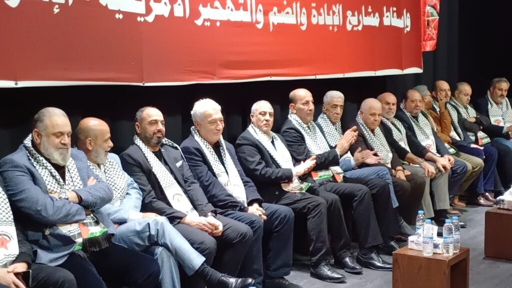 ثم ألقى *عضو المكتب السياسي للجبهة الديمقراطية ومسؤولها في لبنان الرفيق يوسف أحمد*، كلمة نقل خلالها تحيات الرفيق القائد نايف حواتمة والأمين العام للجبهة الرفيق فهد سليمان ووجه تحية الوفاء للشهداء والأسرى والجرحى في فلسطين ولبنان ولعموم أبناء الشعب الفلسطيني وأحرار العالم وقوى المقاومة التي وقفت الى جانب الشعب الفلسطيني، مؤكدا بأن شعبنا بصموده وتضحياته استطاع أن يحبط مشروع الإبادة الجماعية والسياسية لشعبنا وقضيتنا، وقدم صورة مشرفة للإنسانية وللكرامة الوطنية، وفجر بصموده انتفاضات شعبية في عواصم العالم وكشف حقيقة المشروع الصهيوني الاستعماري، الذي تتواصل فصوله في الضفة والقدس من خلال الاستيطان والحصار والضم والتهجير وتدمير المخيمات. وأكد ان حكومة الفاشية الصهيونية تسعى من خلال اعتداءاتها على فلسطين ولبنان ودول وشعوب المنطقة أن تفرض مشاريعها الاستعمارية التوسعية في سياق المشروع الصهيوني المسمى إعادة ” هندسة الشرق الأوسط ” الهادف الى تكريس وفرض الهيمنة والسيطرة على ثروات المنطقة.