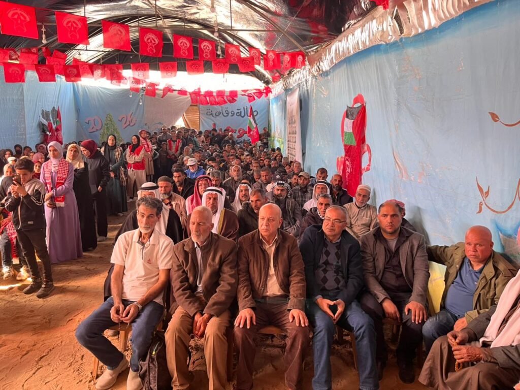 المسار :نظمت الجبهة الديمقراطية لتحرير فلسطين محافظة رفح احتفالاً حاشداً تحت شعار ” نحو خطة وطنية لتعزيز صمود أبناء شعبنا من خلال إعادة الإعمار ووقف مخططات التهجير” وذلك في قاعة ابو جبل بمنطقة المواصي جنوب قطاع غزة بحضور الرفيق صالح ناصر عضو المكتب السياسي وأمين اقليم قطاع غزة والرفيق ابو سالم معمر عضو المكتب السياسي و أعضاء اللجنة والقيادة المركزية وصف واسع من قيادات وكوادر الجبهة بمحافظة رفح وممثلي الفصائل والقوى الوطنية والإسلامية واللجنة الشعبية للاجئين مخيم رفح والوجهاء والمخاتير والاتحادات النسوية وشخصيات اعتبارية وذوي الشهداء والاسرى.