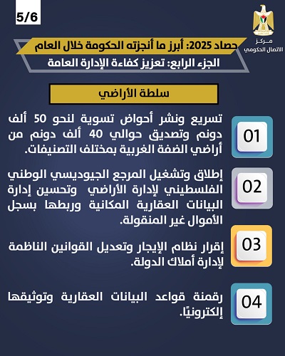 كما أطلقت سلطة الأراضي وشغّلت المرجع الجيوديسي الوطني الفلسطيني لإدارة الأراضي، وعملت على تحسين إدارة البيانات العقارية المكانية وربطها بسجل الأموال غير المنقولة.