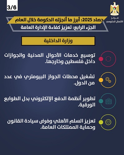 واصلت وزارة الداخلية التوسع في تقديم خدمات الأحوال المدنية والجوازات داخل فلسطين وخارجها، وشغّلت محطات الجواز البيومتري في عدد من الدول العربية والأجنبية، كما طورت أنظمة الدفع الإلكتروني بدل الطوابع الورقية، وعززت جهودها في ترسيخ السلم الأهلي وفرض سيادة القانون وحماية الممتلكات العامة.
