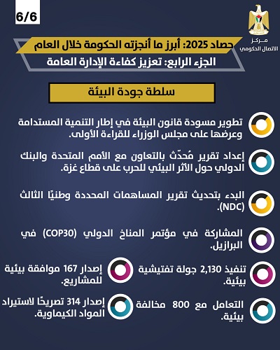 حققت سلطة جودة البيئة تقدمًا ملحوظًا على صعيد التشريعات والرقابة البيئية، حيث طوّرت مسودة “قانون البيئة في إطار التنمية المستدامة” وعرضتها على مجلس الوزراء للقراءة الأولى، كما أعدّت تقريرًا محدثًا بالتعاون مع الأمم المتحدة والبنك الدولي حول الأثر البيئي للحرب الإسرائيلية على قطاع غزة، وبدأت بتحديث تقرير المساهمات المحددة وطنيًا الثالث (NDC)، إلى جانب مشاركتها في مؤتمر المناخ (COP30) في البرازيل.