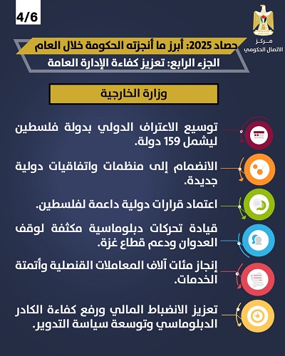 حققت وزارة الخارجية والمغتربين إنجازات مهمة، أبرزها توسيع قاعدة الاعتراف الدولي بدولة فلسطين لتشمل 159 دولة، والانضمام إلى منظمات واتفاقيات دولية جديدة، واعتماد قرارات دولية لصالح فلسطين. كما قادت تحركات دبلوماسية مكثفة لوقف العدوان على شعبنا ودعم قطاع غزة، وأنجزت مئات آلاف المعاملات القنصلية مع التوسع في أتمتة الخدمات، إلى جانب تعزيز الانضباط المالي ورفع كفاءة الكادر الدبلوماسي، وإنجاز واحدة من أكبر عمليات تدوير الطواقم والبعثات؛ لتعزيز الكفاءة وضمان تبادل الخبرات.
