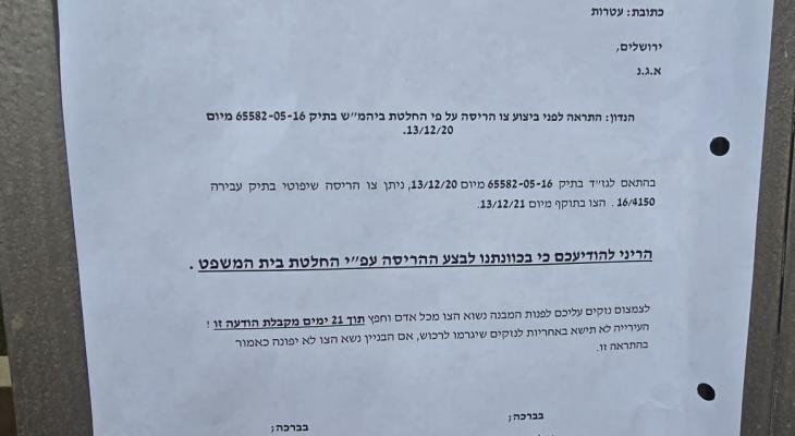 المسار :أخطرت سلطات الاحتلال الإسرائيلي، اليوم الثلاثاء، بهدم سبعة منازل مأهولة في الحي الشرقي من قرية قلنديا شمال مدينة القدس المحتلة، مع تحديد مهلة 21 يومًا لإخلائها وتنفيذ الهدم.