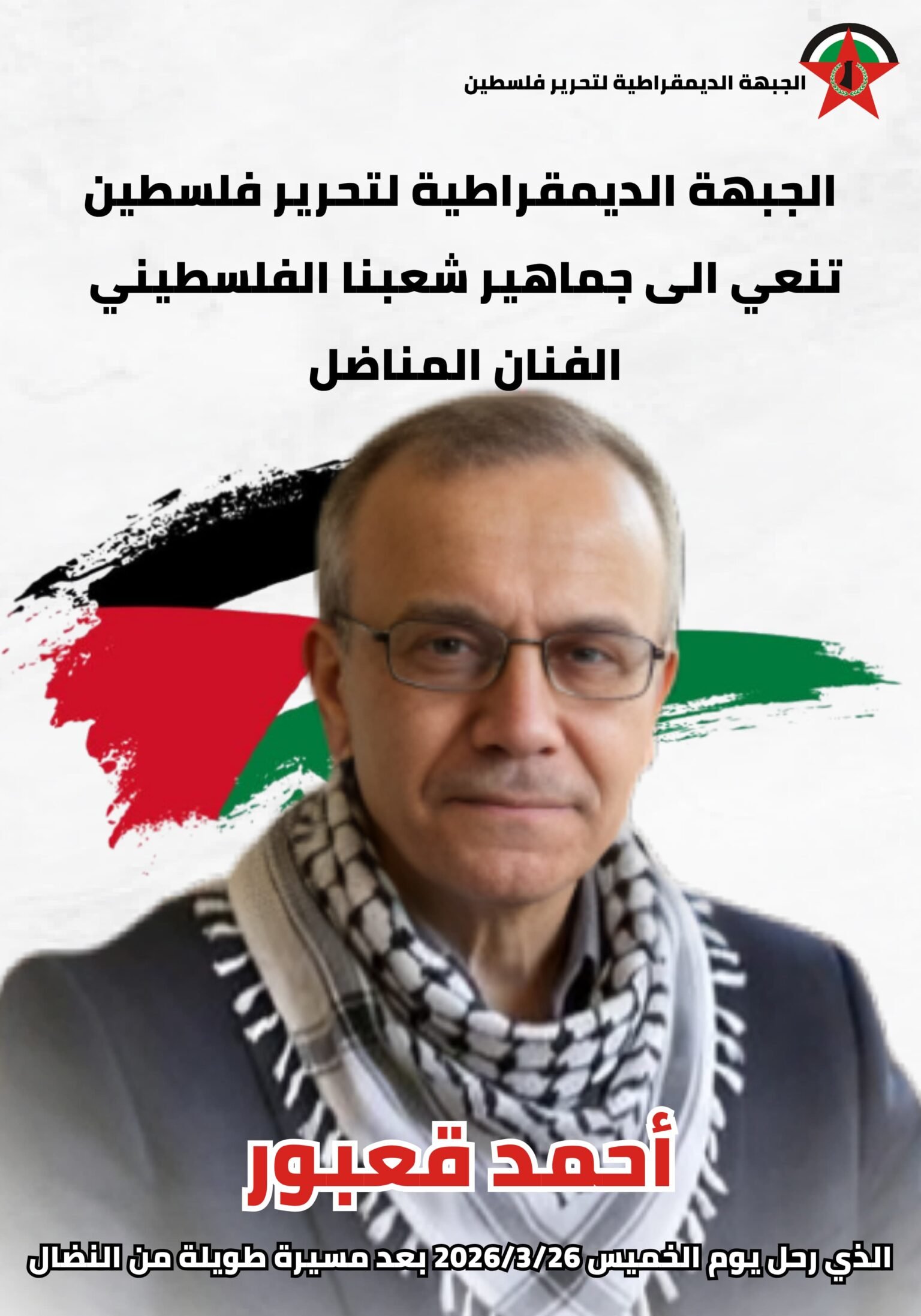 إننا في الجبهة الديمقراطية، إذ ننعى الفنان المبدع أحمد قعبور ، نستحضر دوره الوطني والثقافي، وإسهامه في تعزيز ثقافة المقاومة والصمود، حيث كان فنه جسرًا بين الشعوب ومنبرًا للكرامة الإنسانية.