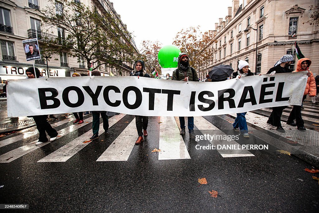 A Boycott Israel banner in Paris in France on November 29, 2025. Demonstration of support for Palestine during the International Day of Solidarity with the Palestinian People. (Photo by Daniel Perron / Hans Lucas / AFP via Getty Images)
